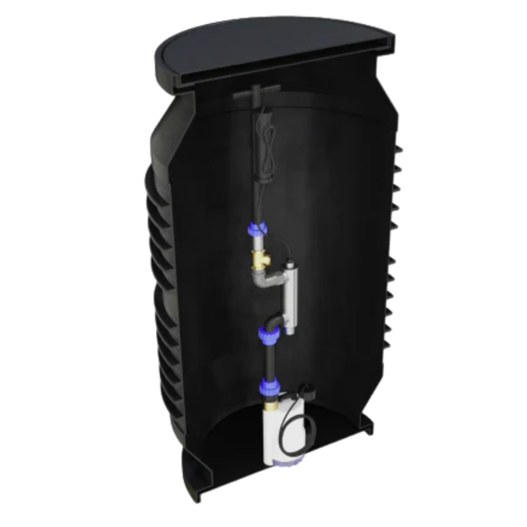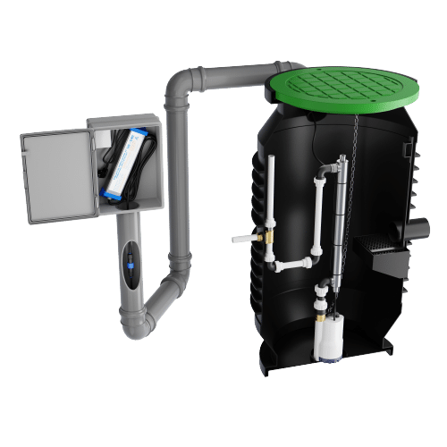 - När nivån nås startar pumpen automatiskt och leder vattnet genom UV-enheten.